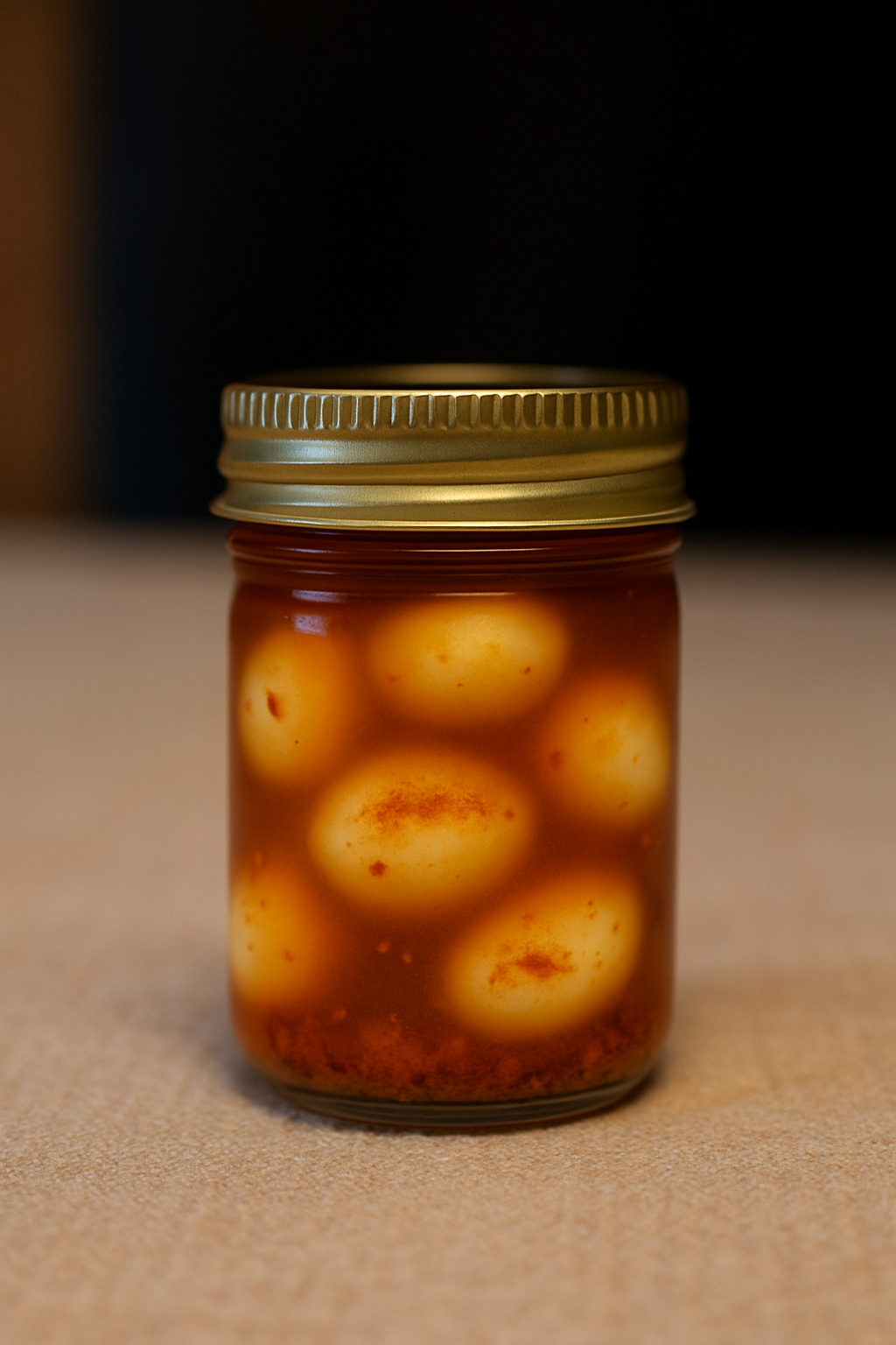 Popular in Southern bars and homes, these are hard-boiled eggs soaked in a vinegar brine with spices for a tangy snack.