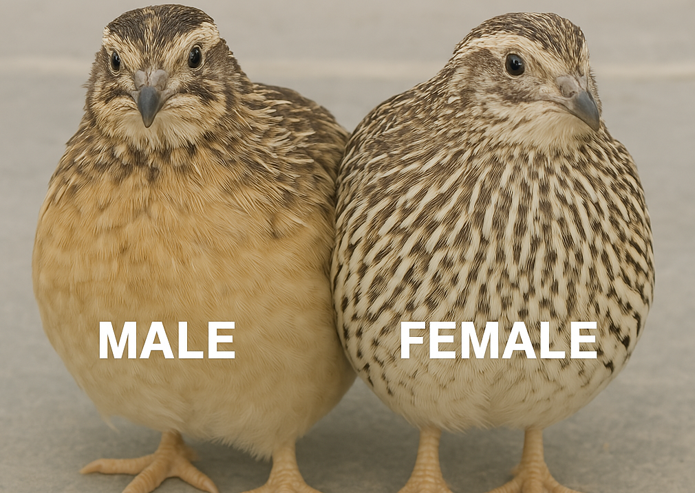 In Coturnix (Japanese) quail, males and females have distinct differences in appearance. Males typically have a more vibrant plumage, with a rich chestnut color and a white throat patch, while females are generally more muted in color, with a dull brownish tone.