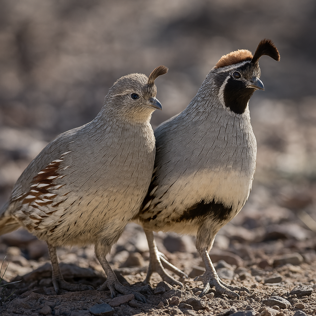 Gambel's quail males and females are visually distinct, with males having a prominent black face mask, a white throat, and a curved topknot, while females are more subdued, and have a smaller topknot, and with a brownish head and less defined markings.