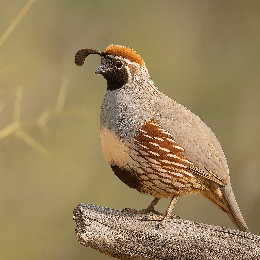 Gambel's quail are one of the few bird species that have a distinctive "topknot" of feathers on their heads, which they can move and adjust. This quirky feather plume, which looks like a small crest, helps them stand out and is particularly prominent in males.