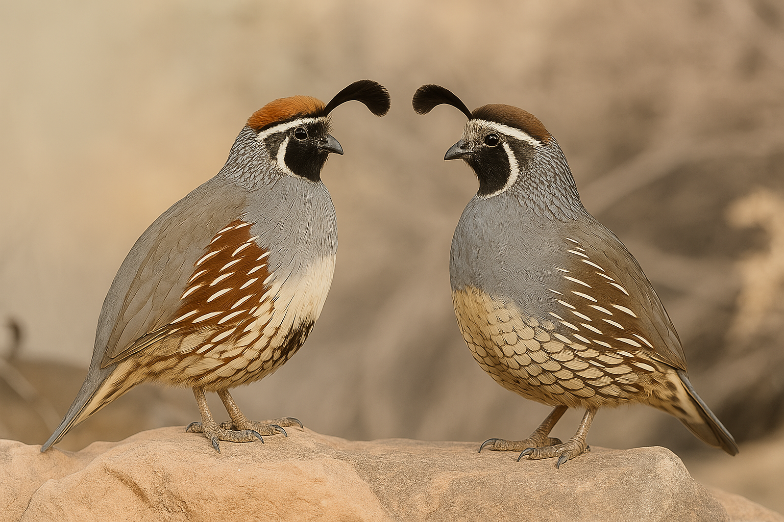 California Quail has a scaled or mottled belly. Gambel’s Quail has a creamy belly with a bold black patch in the center.