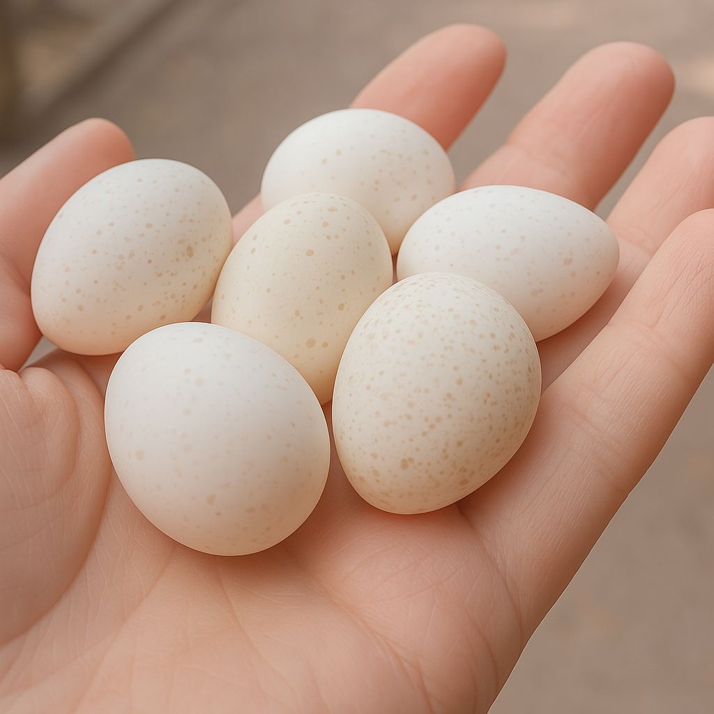 Texas blue scaled quail eggs are small, typically weighing around 8-10 grams. They have a light tan or cream-colored shell, often speckled with darker brown spots, giving them a textured appearance. The eggs are smooth and firm, with a slightly glossy finish. Their size and markings make them visually appealing, with a delicate and rustic look compared to other quail eggs.